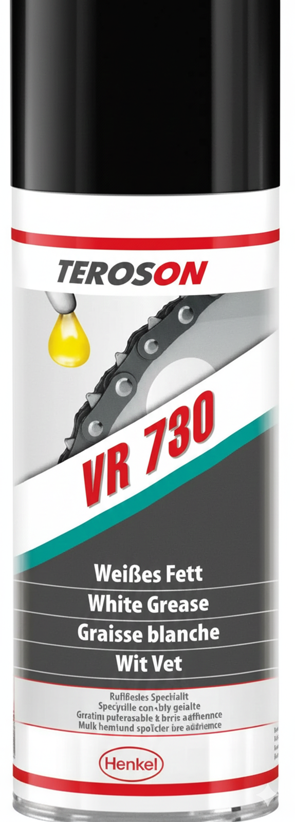 Teroson VR 730 je biely lubrikačný aerosólový sprej používaný na mazanie otvorených mechanizmov, ozubených súkolesí, reťazí a spojok.
